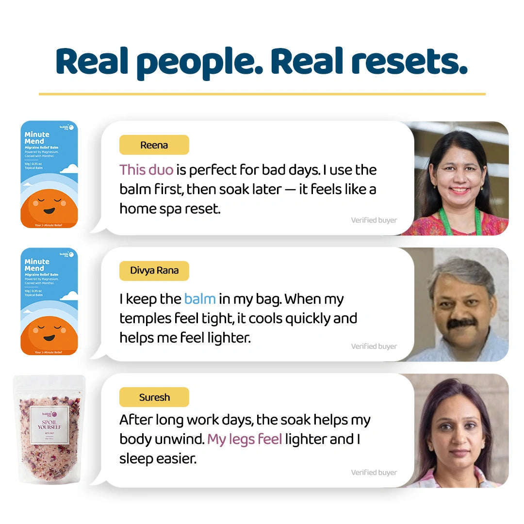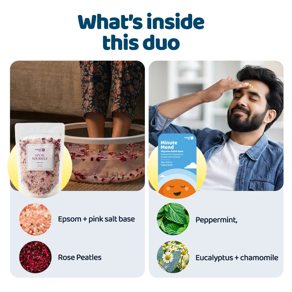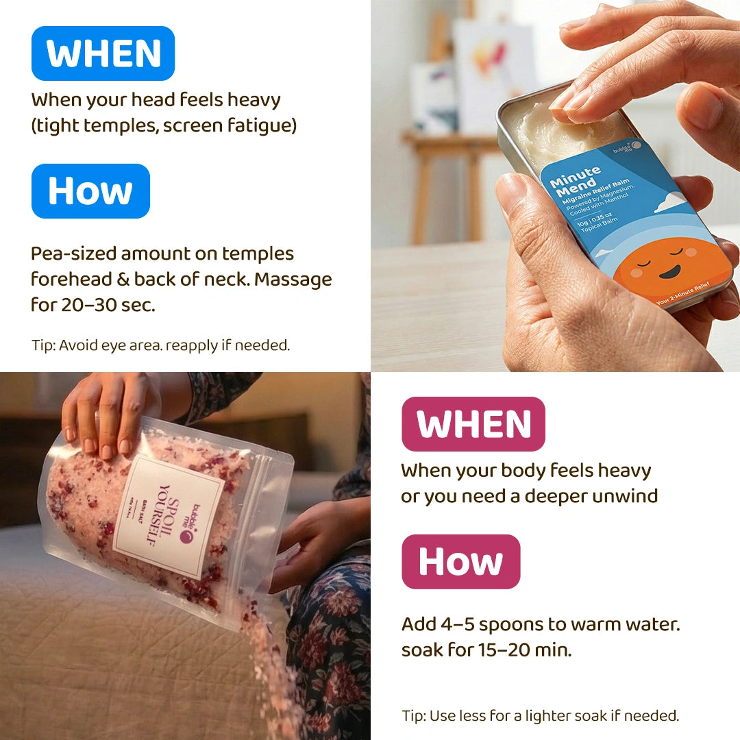 - Spoil Yourself Bath Salt: Add 3–4 spoons of bath salt to warm water and soak for 15–20 minutes.Apply balm on temples, forehead & back of neck, gently massage.