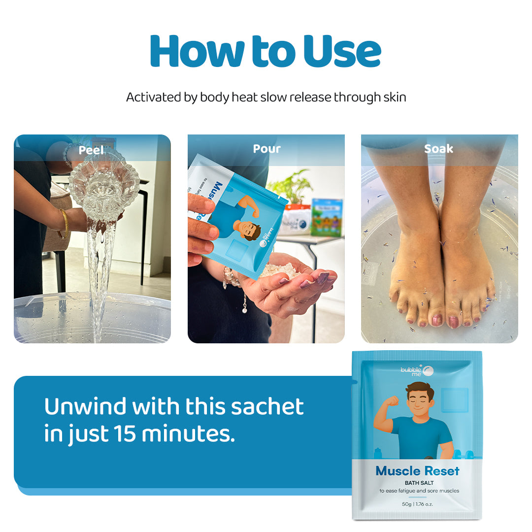 - Fill a Bucket: Open and pour the sachet of bath salt into a bucket of warm water.