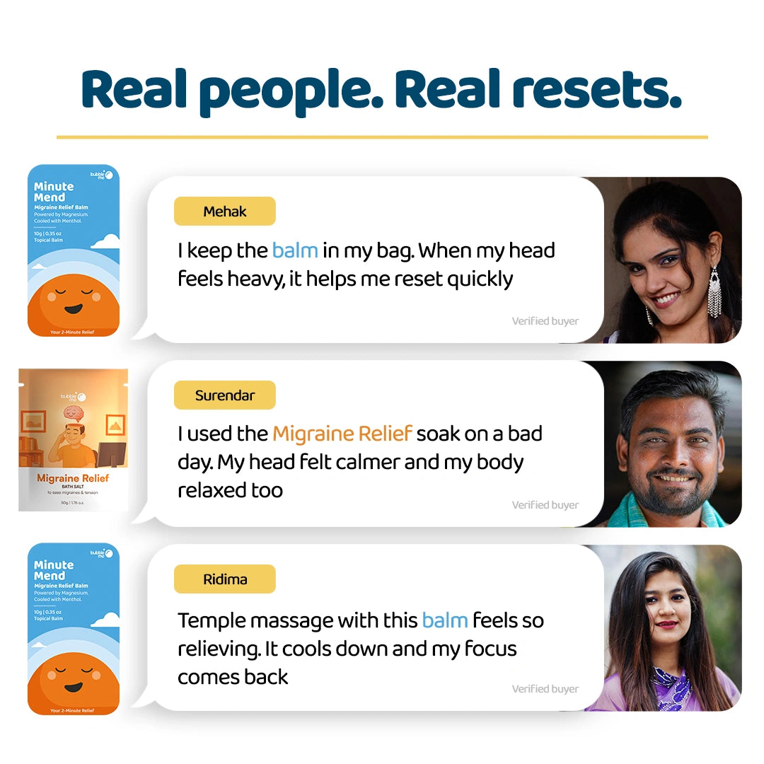 - Minute Mend Magnesium Balm: Apply the balm on temples, forehead and the back of your neck. Gently massage for a cooling, soothing relief.