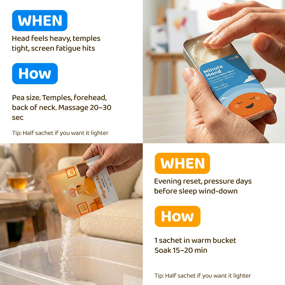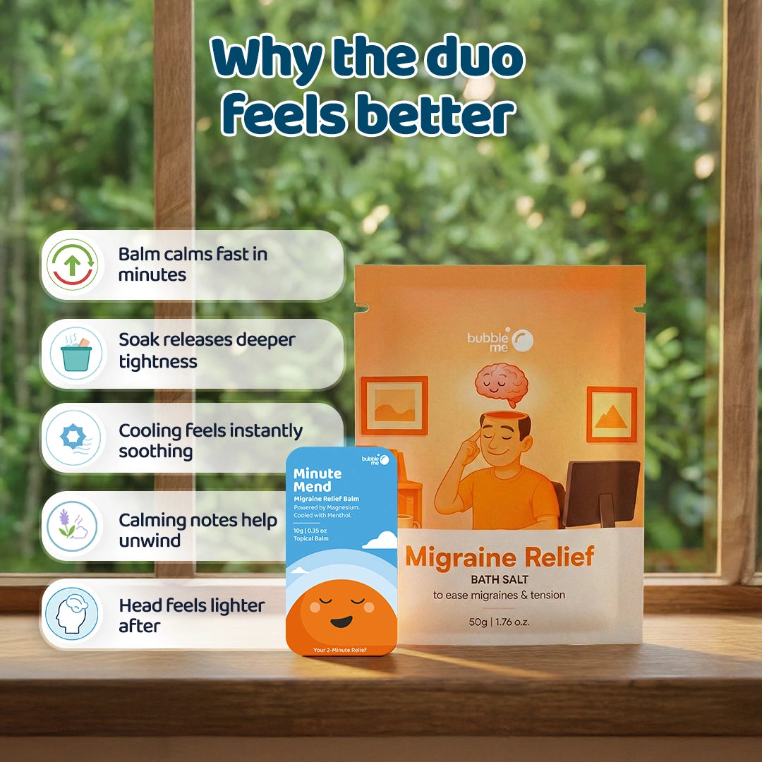 - Migraine Relief Bath Salt Sachet: Add 3–4 spoons of bath salt to warm water and soak for 15–20 minutes to help relax the body and ease tension.