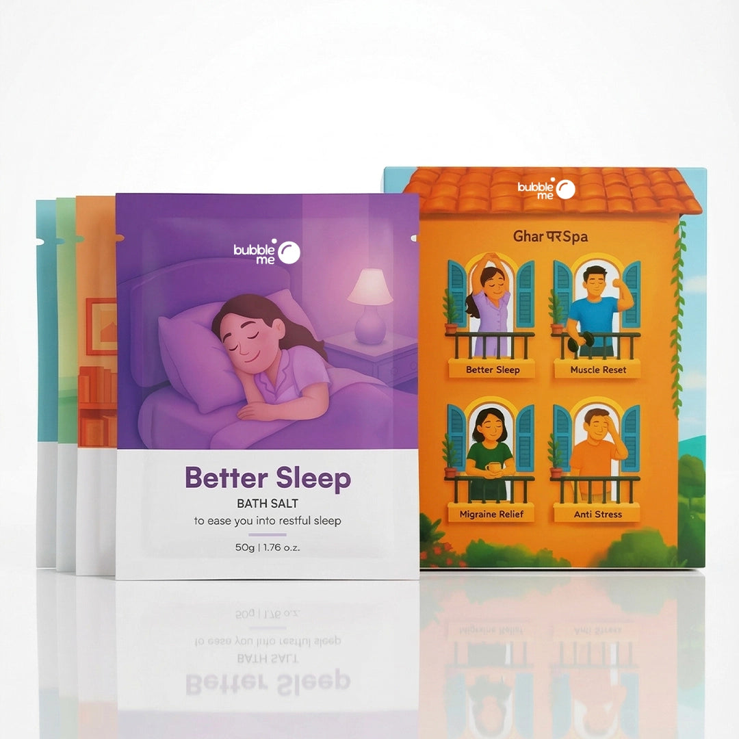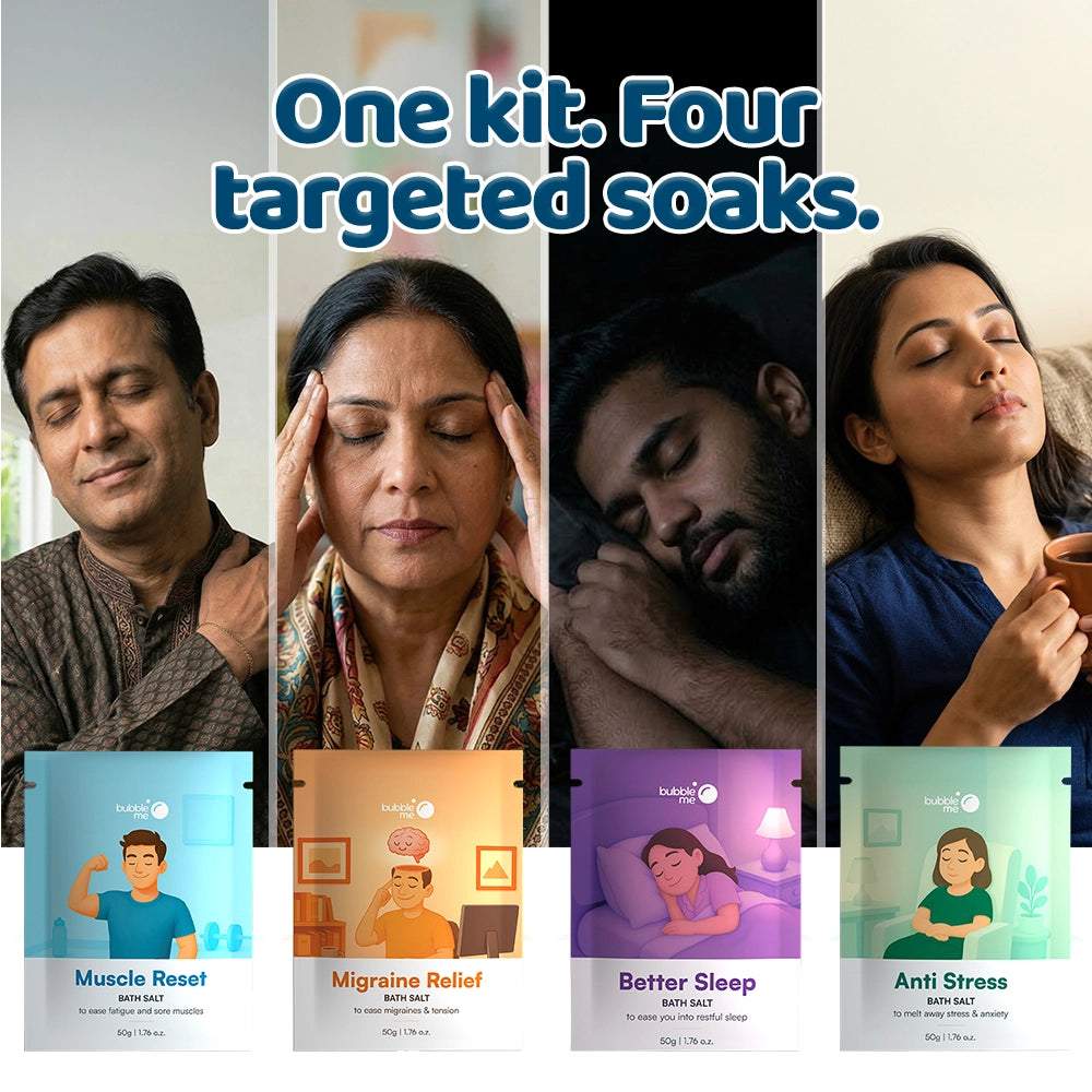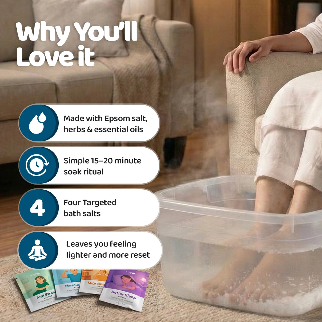 3) Migraine Relief (Peppermint + Eucalyptus + Chamomile): Epsom Salt (Magnesium sulfate), Pink Salt, Lavender Oil (Lavandula angustifolia), Peppermint Oil (Mentha piperita), Eucalyptus Oil (Eucalyptus globulus), Chamomile Oil (Matricaria chamomilla), Blue Corn Flower Herb (Centaurea cyanus), Chamomile Herb (Matricaria chamomilla), Gulab Herb, Vitamin E Acetate (Tocopheryl acetate), Phenoxyethanol, Ethylhexylglycerin.